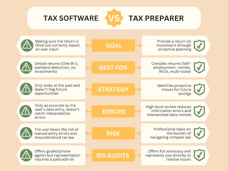 - Software handles compliance. A professional provides strategy, error prevention, and representation if the IRS contacts you.